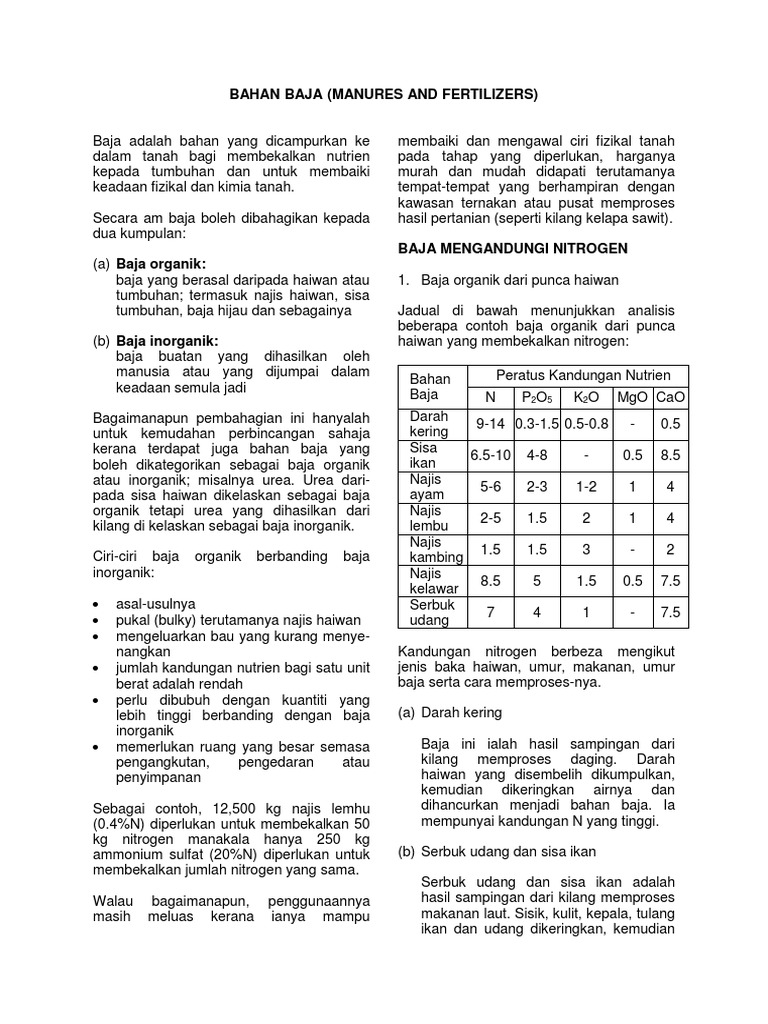 Nitrogen fosforus dan kalium. Contoh baja organik asli termasuklah pupuk kandang sluri kompos cacing gambut rumpai laut kumbahan dan guano. Jadual 1 Jenis baja nisbah kandungan nutrien kadar dan masa.