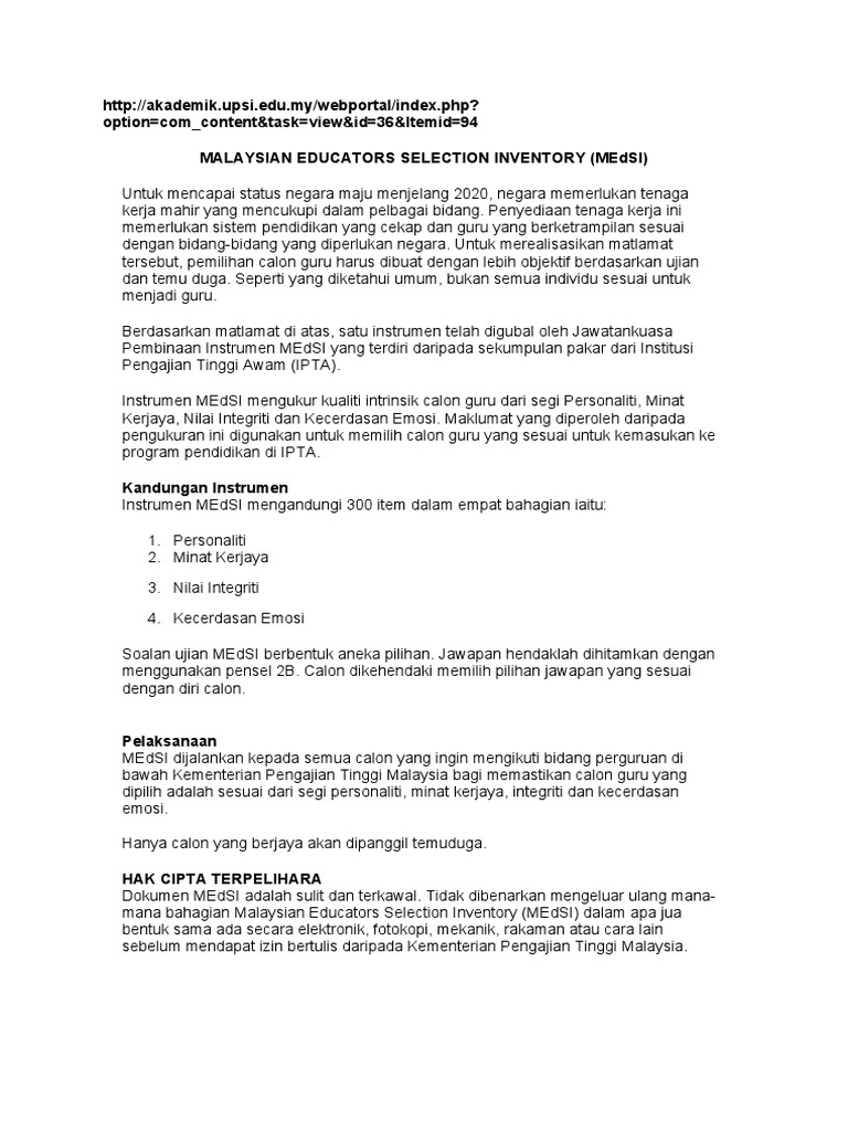 Mana satu betul ni. Ujian Inventori Pemilihan Pendidik Malaysia Malaysian Educators Selection Inventory MEdSI ialah suatu ujian pemilihan untuk kemasukan ke Program Pengajian Pendidikan Lepasan STPMSetaraf di Institut Pengajian Tinggi AwamSoalan dalam ujian ini adalah berbentuk psikometrik. Semakan boleh dibuat melalui pautan di bawah.